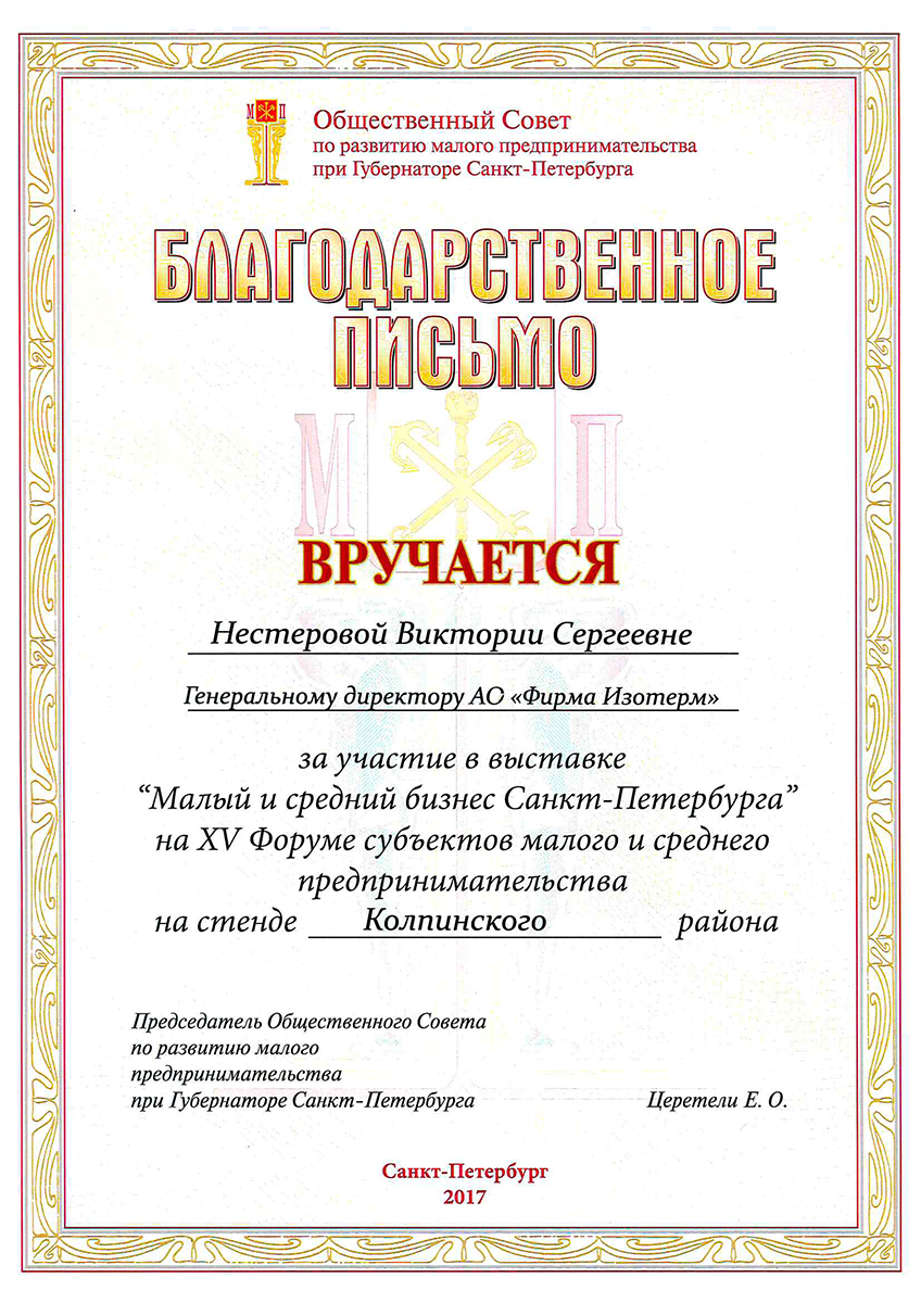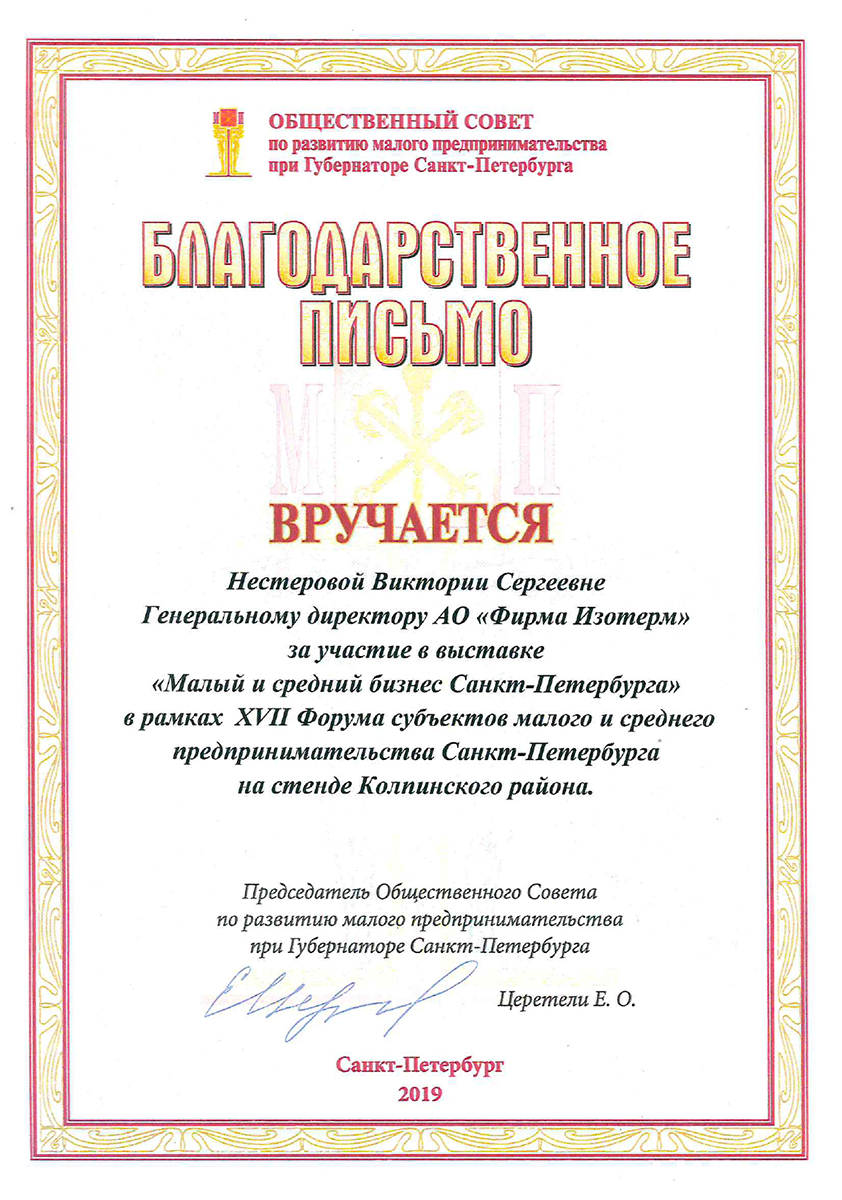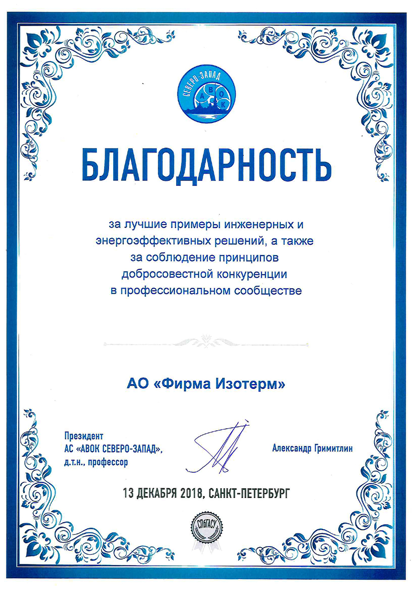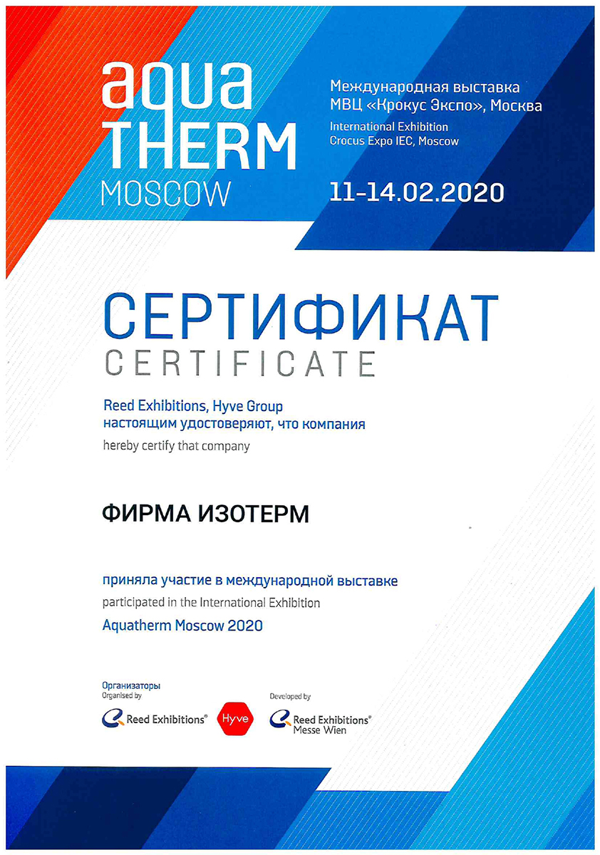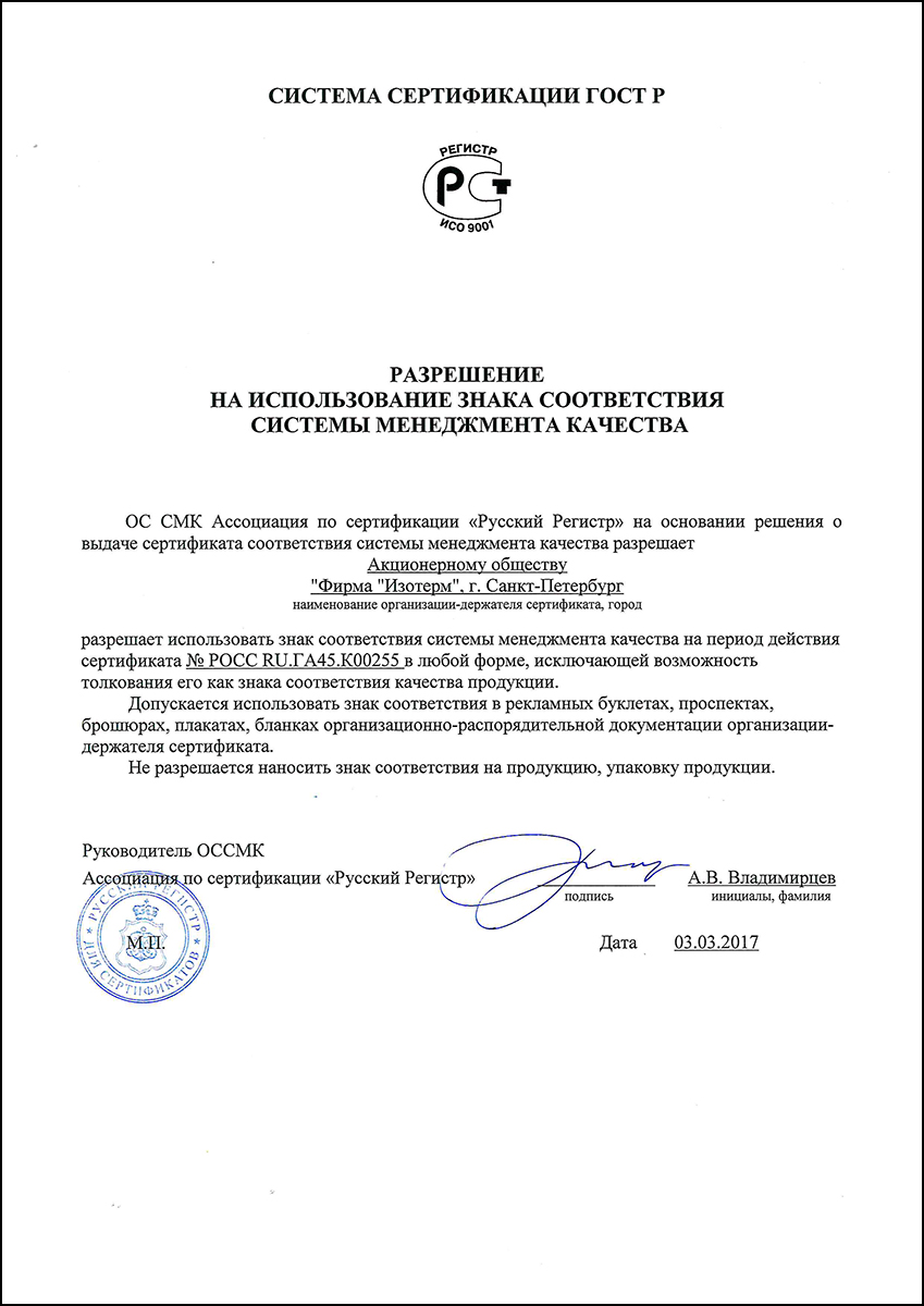 Isoterm Firm JSC received the ISO 9001 international standard certificate, which means that the company conforms with the current business, ecology and safety regulations, has professional management and high technical levels.